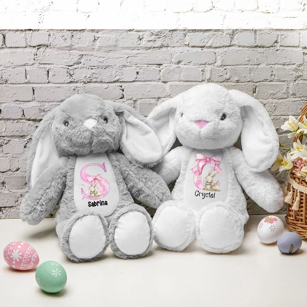 Entzückende Hasenpuppe – Das personalisierte Hasenpuppenspielzeug mit rosa Schleife und Initialen zeigt ein bezauberndes Kaninchen mit rosa Schleifendesign. Dieses süße und kuschelige Plüschtier ist perfekt für die Kleinen und verleiht jedem Raum einen Hauch von Verspieltheit.